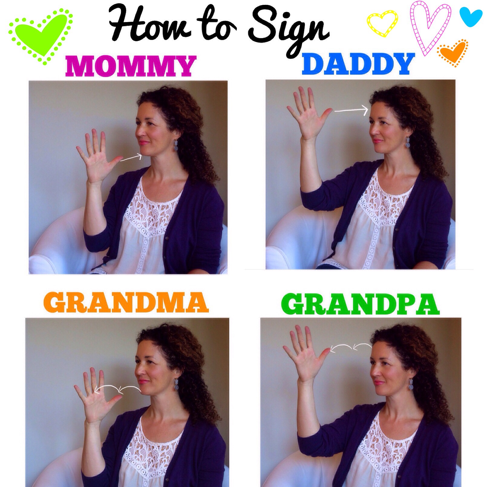Don’t forget to show your babies how to sign their favourite people they see in person, in photos, on FaceTime or Skype each day, these faces will be so familiar. My babies didn’t sign MOMMY very much because I was mostly always with them, but it was easier for me to show them the sign for DADDY when he walked in the door from work, or GRANDMA & GRANDPA when they visited. I also name everyone in our family photos by pointing at them, then signing who they were.